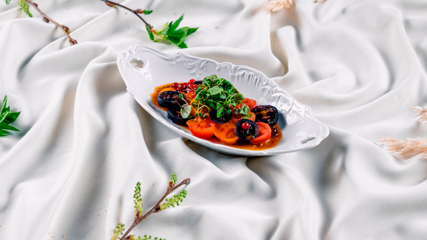 • Французское карпаччо из трех видов фермерских маринованных томатов.